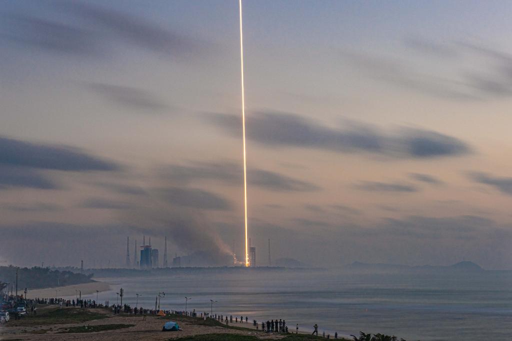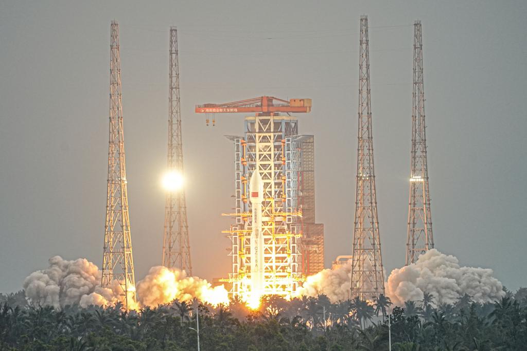 12月26日、海南省文昌市の海南商業宇宙発射場から打ち上げられた、運搬ロケット「長征8号A」。搭載された衛星インターネット用低軌道衛星群の第17陣は予定の軌道に乗り、同発射場で10回目となる打ち上げ任務は成功した。(文昌=新華社記者/蒲暁旭)