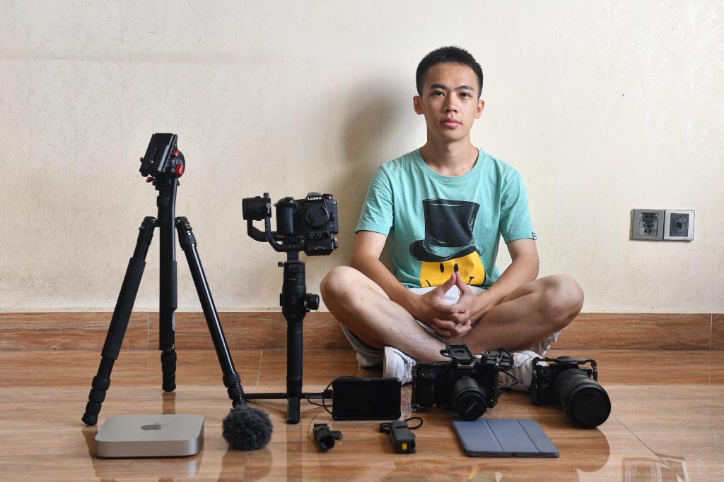 海南省文昌市でロケット打ち上げを撮影するために購入したシネマカメラを見せる宇宙ファンの金昱昌(きん・いくしょう)さん。(2021年9月19日撮影、文昌=新華社記者/蒲暁旭)