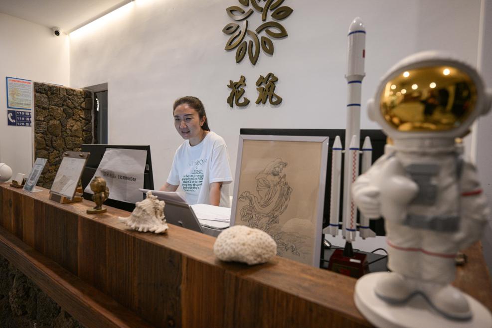 12月24日、海南省文昌市竜楼鎮海辺村の民宿「雲巻雲舒」で、フロントに立つ経営者の祝影(しゅく・えい)さん。(文昌=新華社記者/蒲暁旭)