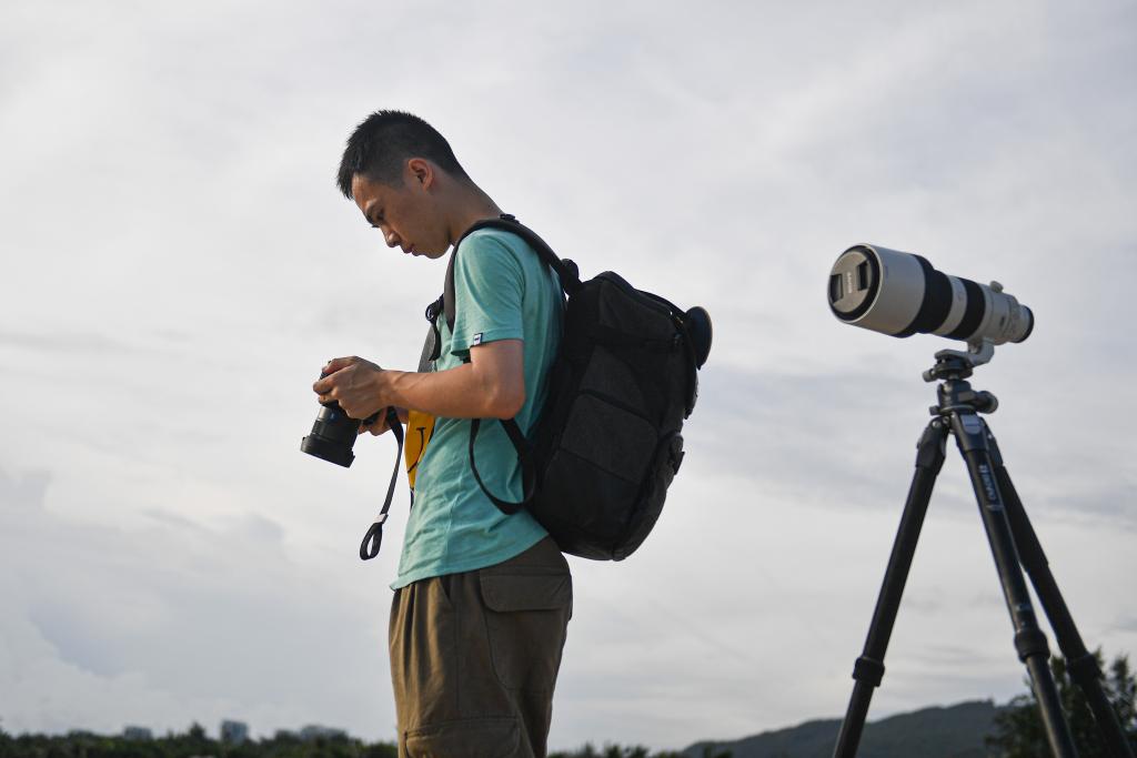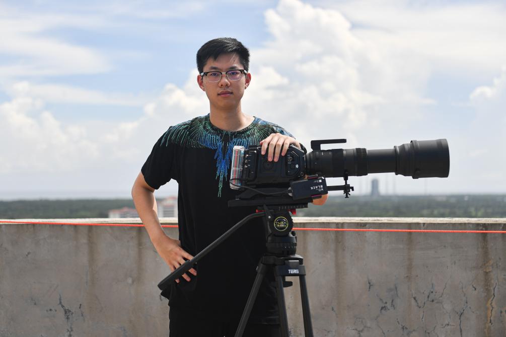 海南省文昌市で、ロケット打ち上げ前に撮影の下見と準備を行う宇宙ファンの楊昊(よう・こう)さん。(2021年9月15日撮影、文昌=新華社記者/蒲暁旭)
