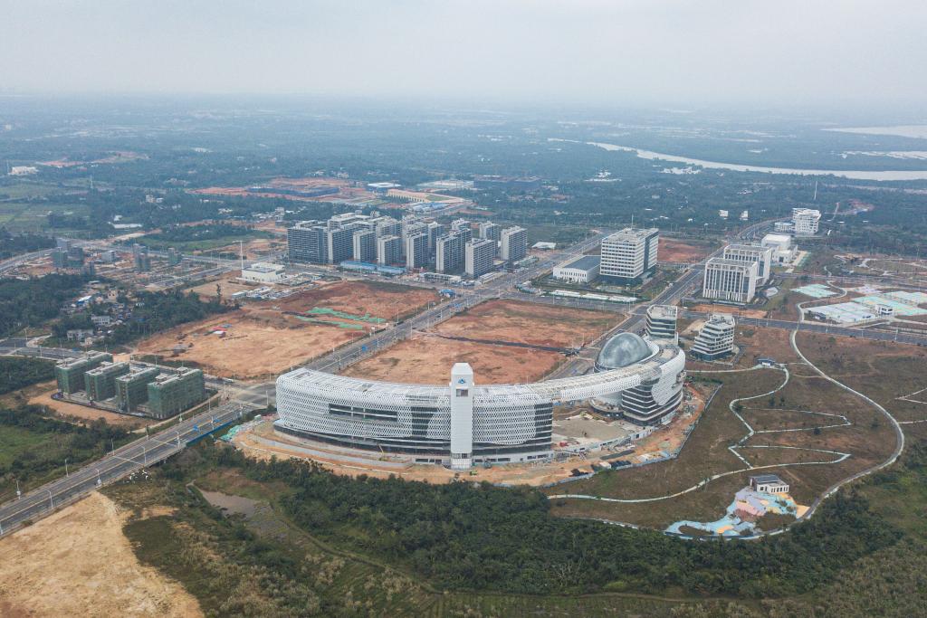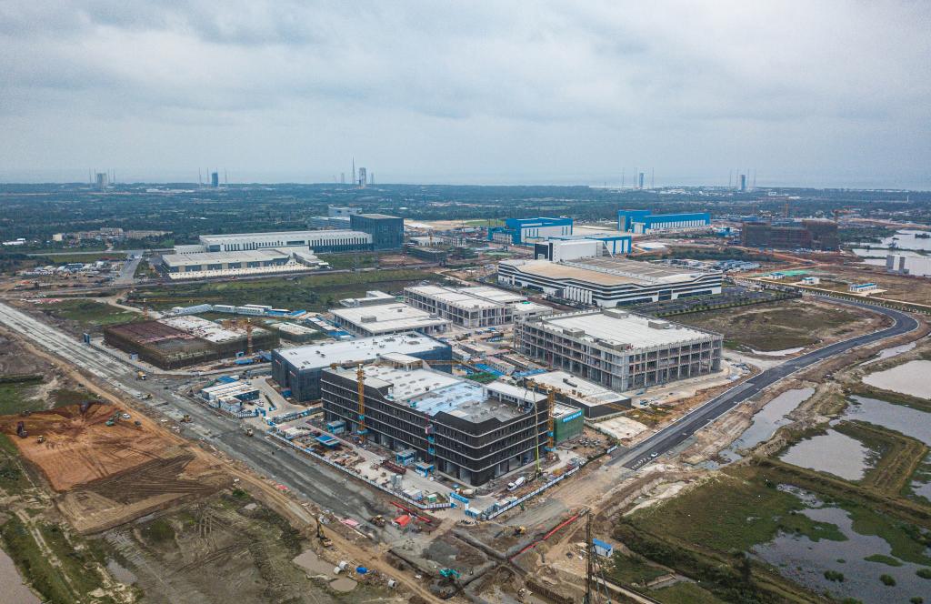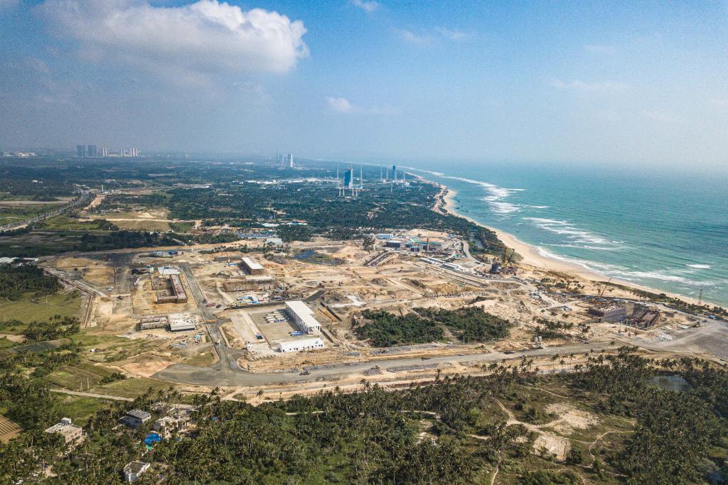2日、海南省文昌市で建設中の宇宙科学技術イノベーション拠点プロジェクト。(ドローンから、文昌=新華社記者/蒲暁旭)