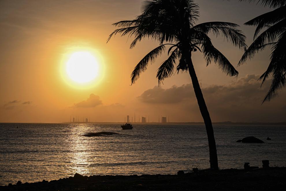 12月24日、海南省文昌市のヤシの木と海。遠くに文昌宇宙発射場と海南商業宇宙発射場が見える。(文昌=新華社記者/蒲暁旭)