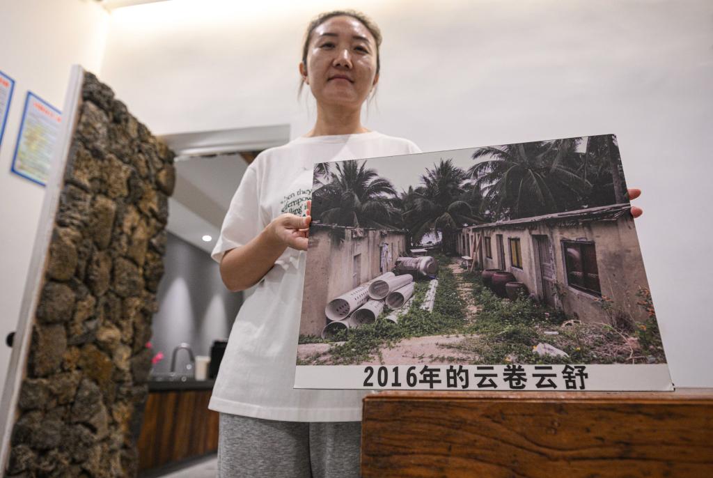 12月24日、海南省文昌市竜楼鎮海辺村の民宿「雲巻雲舒」で、開業前の写真を掲げる経営者の祝影(しゅく・えい)さん。(文昌=新華社記者/蒲暁旭)