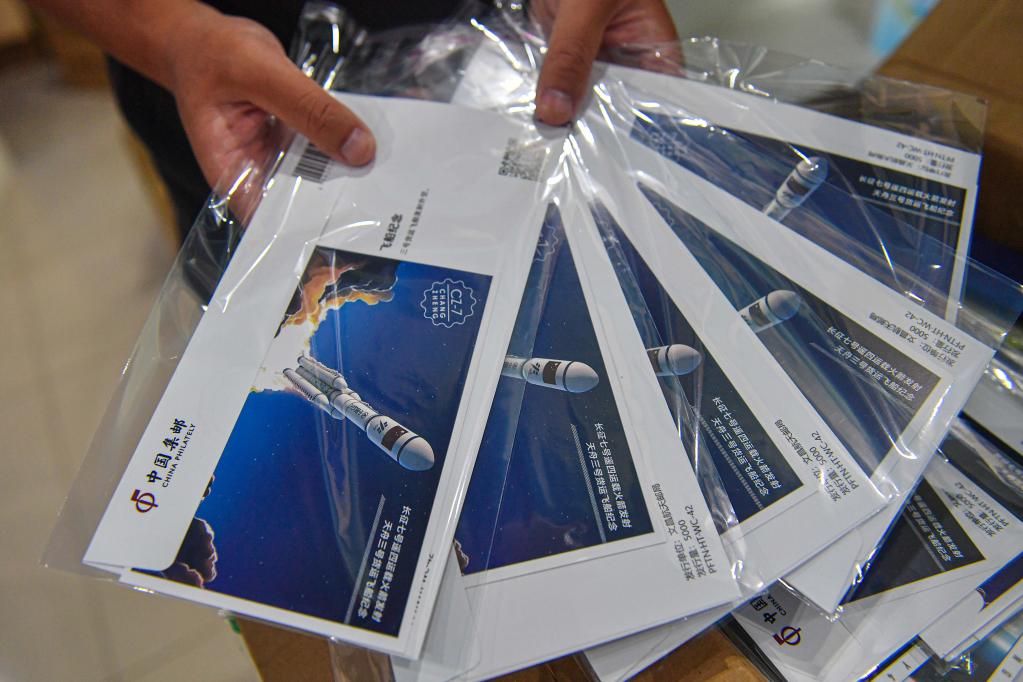 海南省文昌市で宇宙ファンの楊昊(よう・こう)さんが購入した宇宙関連の郵便記念品。(2021年9月21日撮影、文昌=新華社記者/蒲暁旭)
