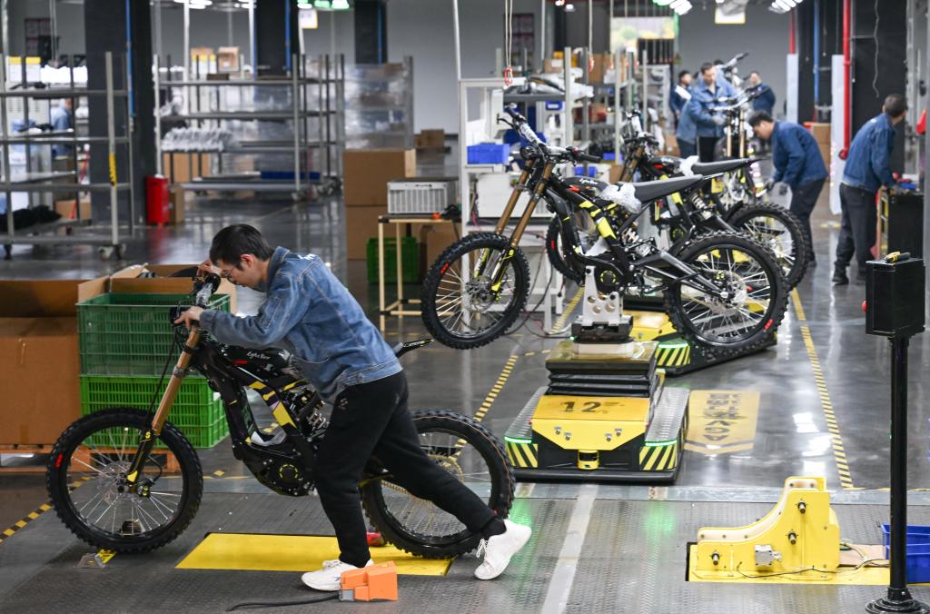12月24日、虬竜科技の工場で新エネバイクを組み立てる従業員。(重慶=新華社記者/陳誠)