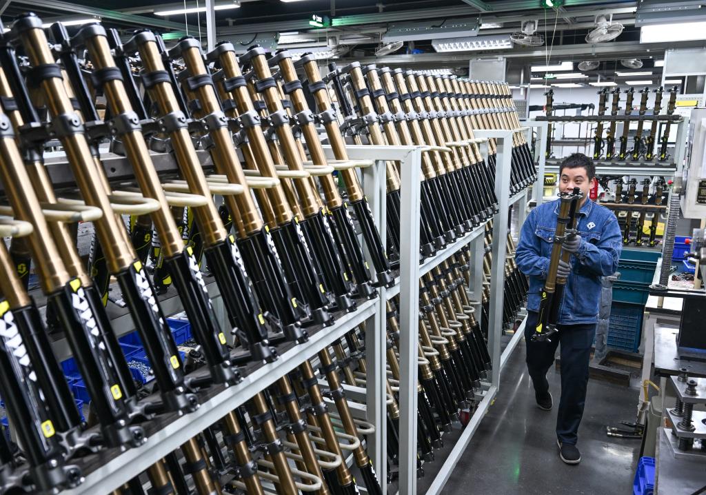 12月24日、虬竜科技の工場で新エネバイクの部品を準備する従業員。(重慶=新華社記者/陳誠)