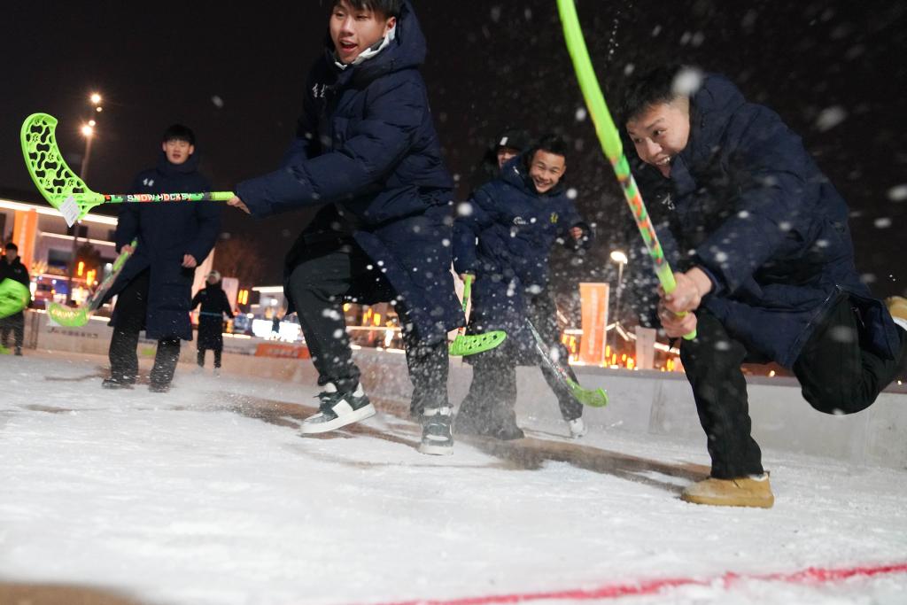 6日、始動式の会場で雪上フロアボールを楽しむ市民。(長春=新華社記者/許暢)