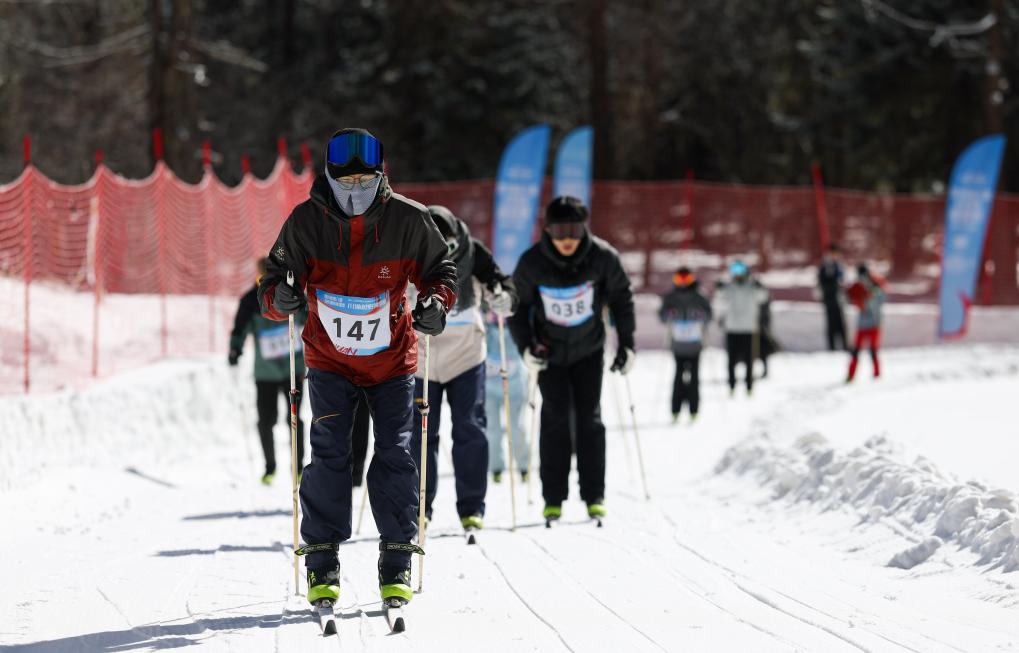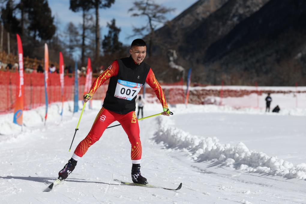 5日、理県畢棚溝スキー場でクロスカントリースキーの大会に参加する選手。(理県=新華社記者/江宏景)