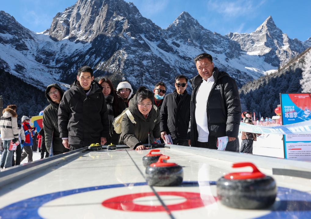 5日、理県畢棚溝スキー場でテーブルカーリングを楽しむ観光客。(理県=新華社記者/江宏景)
