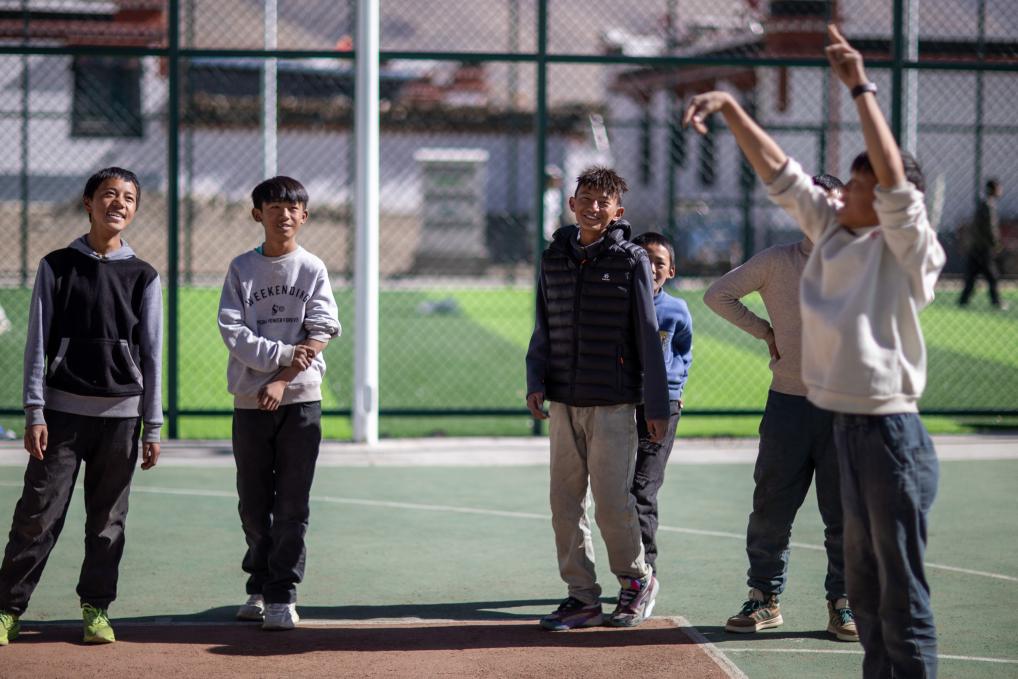 5日、シガツェ市ティンリ県長所郷森嘎村でバスケットボールをする少年。(シガツェ=新華社記者/李健)