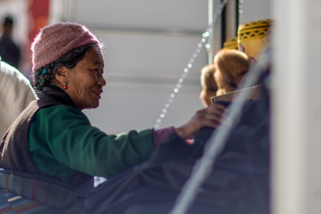5日、シガツェ市ティンリ県長所郷森嘎村の村史館前の広場で、日なたぼっこをする住民。(シガツェ=新華社記者/姜帆)