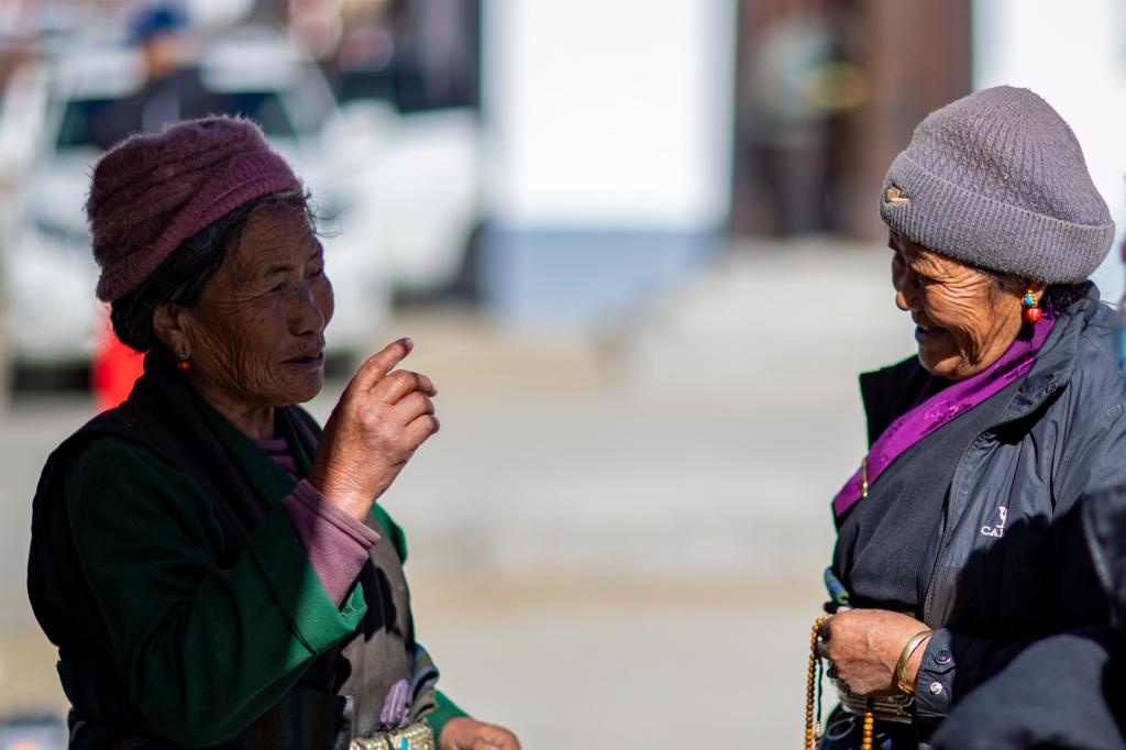 5日、シガツェ市ティンリ県長所郷森嘎村の市場で世間話をする住民。(シガツェ=新華社記者/姜帆)