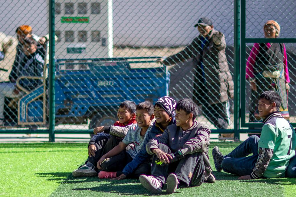 5日、シガツェ市ティンリ県長所郷森嘎村のサッカー場で、サッカーを見学する少年ら。(シガツェ=新華社記者/姜帆)