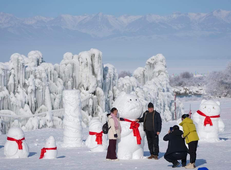 3日、昭蘇県の氷雪パークで氷の彫刻作品を観賞する観光客。(昭蘇=新華社記者/胡虎虎)