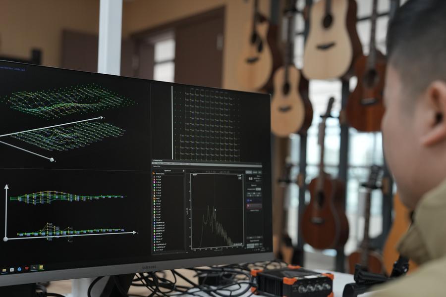 7日、湖南省卡瑪楽器製造の研究開発ラボで、ギターの表板と裏板の振動を観察する研究者。(寧郷=新華社記者/薛宇舸)
