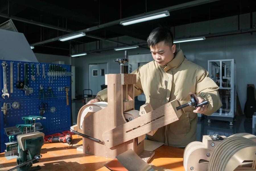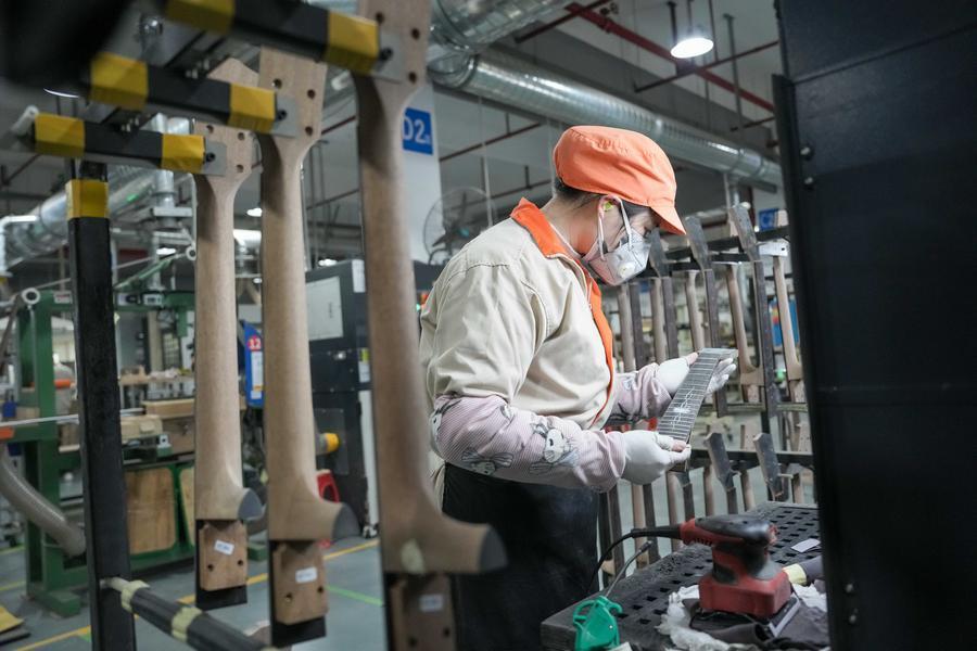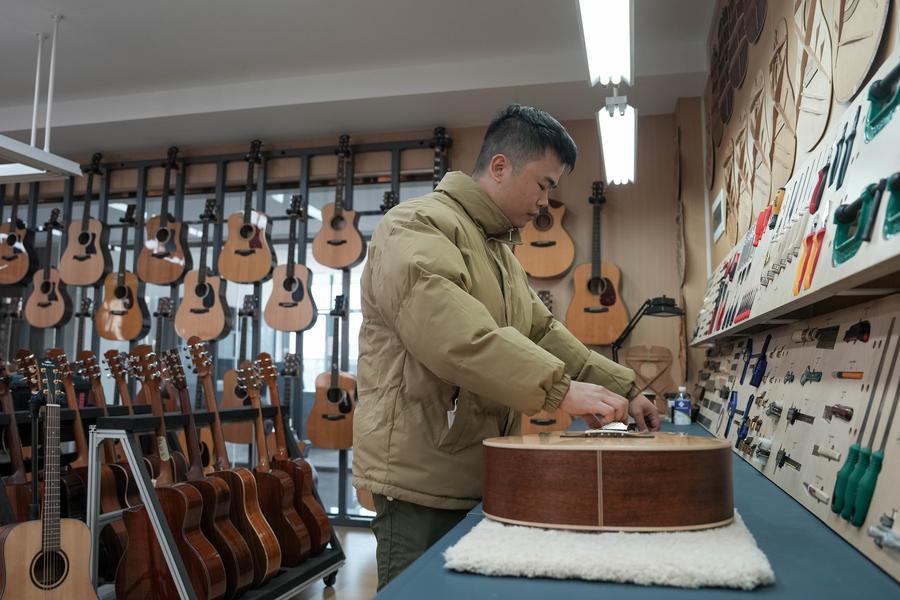 【新華社長沙1月10日】中国湖南省寧郷市の楽器メーカー、湖南省卡瑪(カマ)楽器製造はここ数年、音響学の研究を通じてギターの音の振動周波数を可視化し、革新的なスマート設備の導入で生産時に生じる誤差を最小限に抑えることで、品質の均一化を実現している。同社のギター年間生産量は現在、10万本を上回り、米国やフランス、タイ、マレーシアなどに輸出されている。