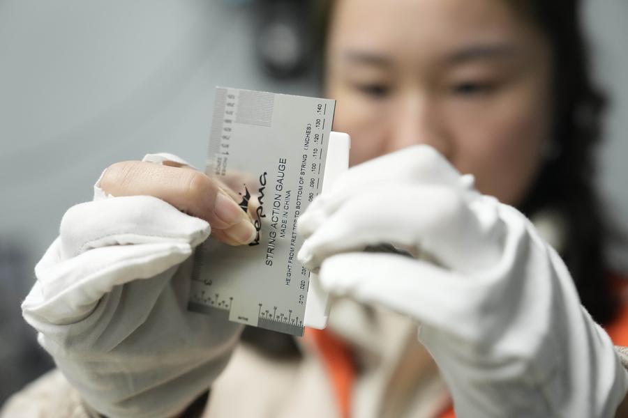 7日、湖南省卡瑪楽器製造の生産ラインで、ギターの部品を検査する従業員。(寧郷=新華社記者/薛宇舸)