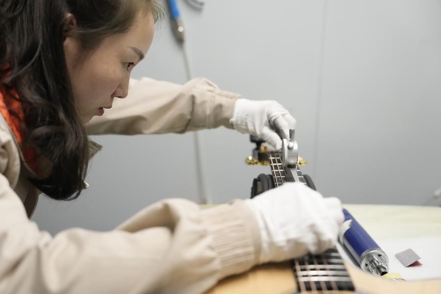 7日、湖南省卡瑪楽器製造の生産ラインで、ギターをチューニングする従業員。(寧郷=新華社記者/薛宇舸)