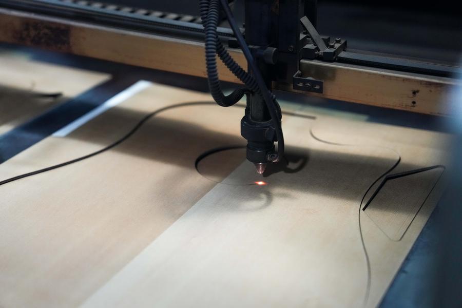 7日、湖南省卡瑪楽器製造の生産ラインで、ギターの表板を切断するレーザー切断機。(寧郷=新華社記者/薛宇舸)