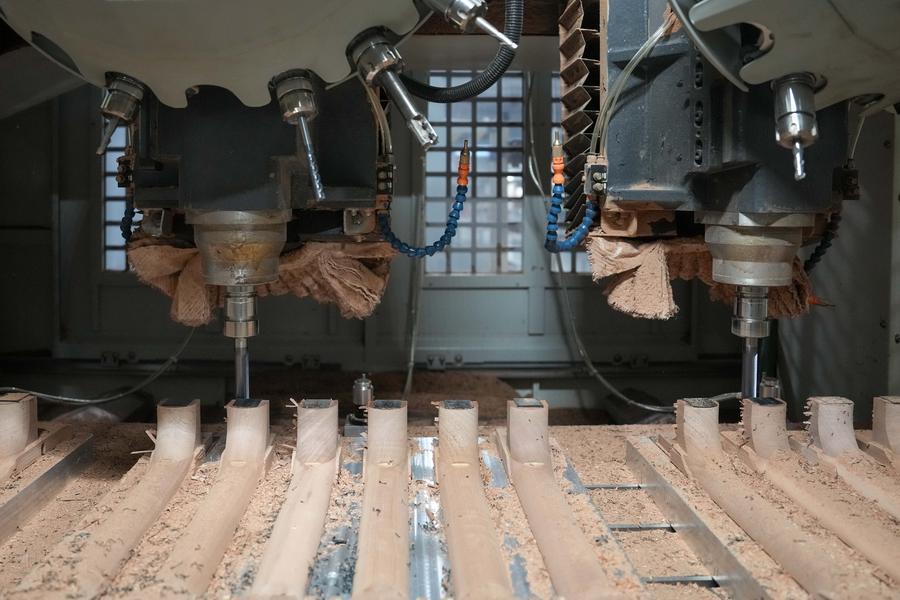 7日、湖南省卡瑪楽器製造のギター生産ラインで稼働するスマート設備。(寧郷=新華社記者/薛宇舸)
