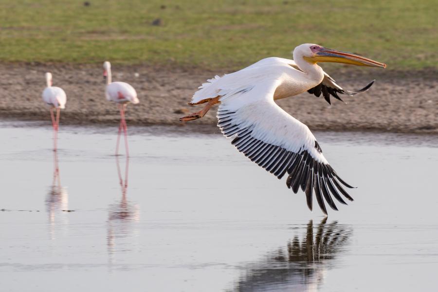 8日、ケニアのアンボセリ国立公園に生息するペリカンとフラミンゴ。(ナイロビ=新華社記者/謝剣飛)