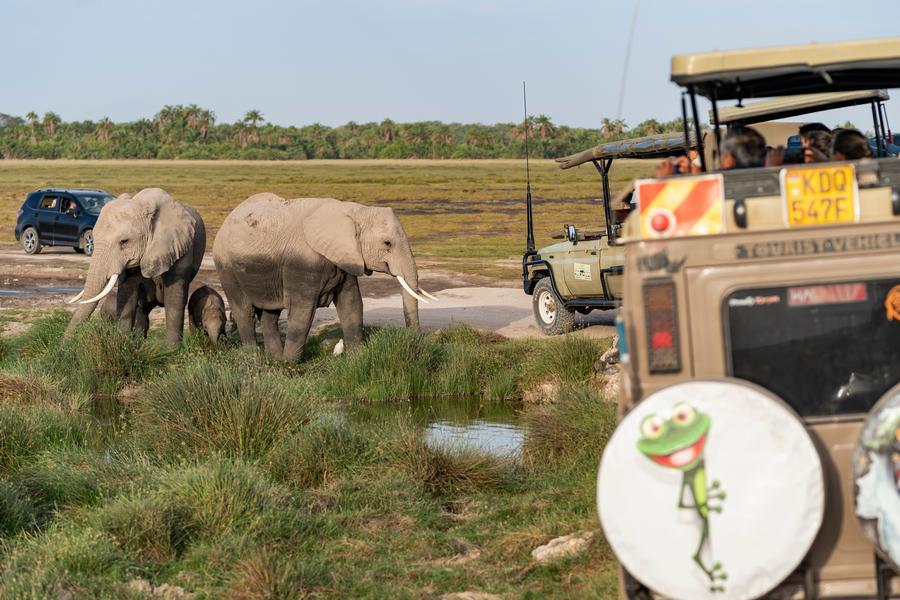 8日、ケニアのアンボセリ国立公園で、車からゾウを観察する観光客。(ナイロビ=新華社記者/謝剣飛)
