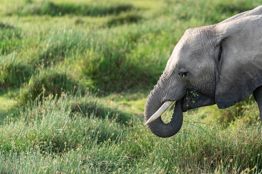 8日、ケニアのアンボセリ国立公園で草を食べるゾウ。(ナイロビ=新華社記者/謝剣飛)