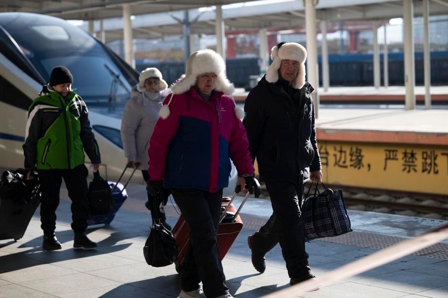8日、綏芬河駅で下車し、出口に向かう観光客。(ハルビン=新華社記者/張濤)