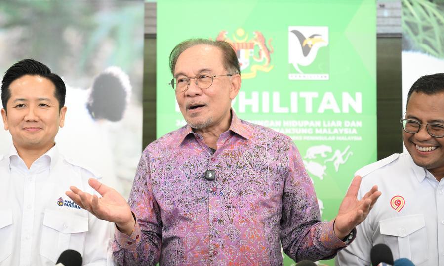 10日、マレーシア国立動物園であいさつする同国のアンワル首相(中央)。(クアラルンプール=新華社記者/程一恒)