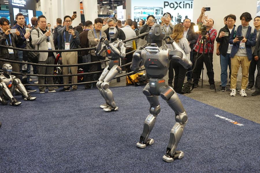 8日、ロボットメーカー智元機器人(AgiBot)のロボットを見る来場者。(ラスベガス=新華社配信/曽慧)