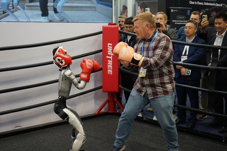 8日、CESに出展したロボットメーカー杭州宇樹科技(ユニツリー・ロボティクス)のロボットとボクシングをする来場者。(ラスベガス=新華社配信/曽慧)