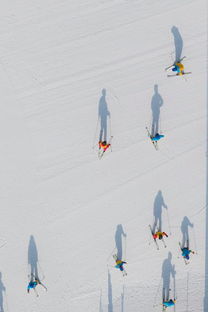 7日、山西省朔州市山陰県の広武国際スキー場で滑りを楽しむ客。(ドローンから、朔州=新華社記者/楊晨光)