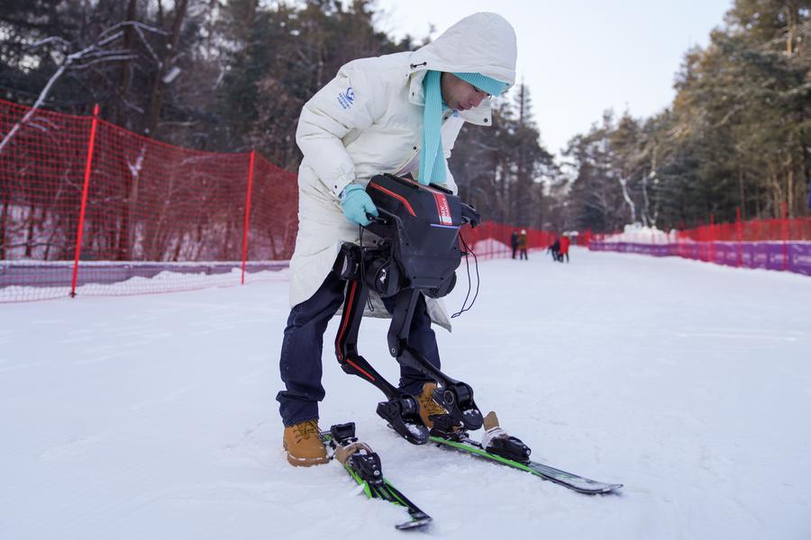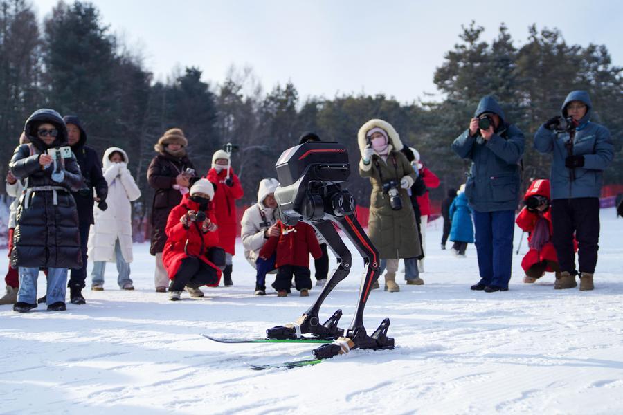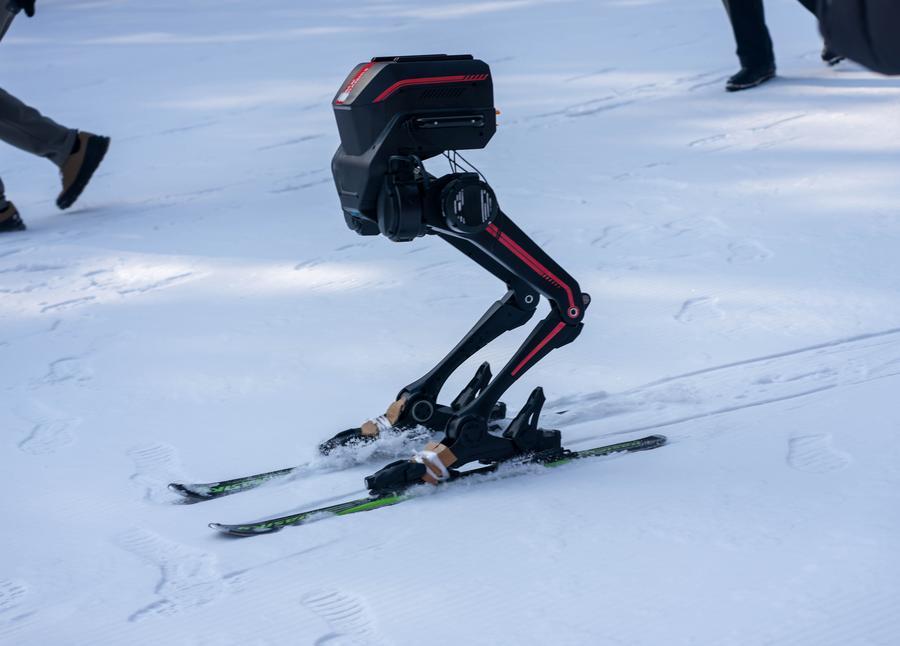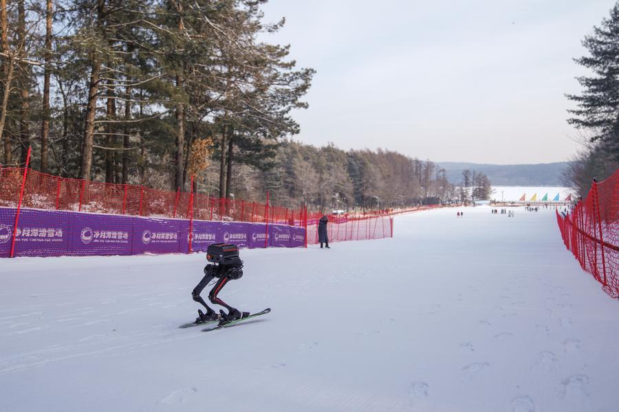 10日、競技会場でスキーをする二足歩行ロボット。(長春=新華社記者/許暢)
