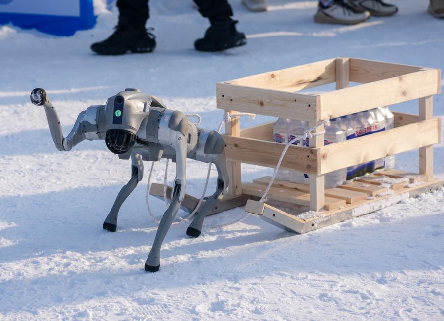 10日、そりレースに参加した四足歩行バイオニックロボット。(長春=新華社記者/許暢)