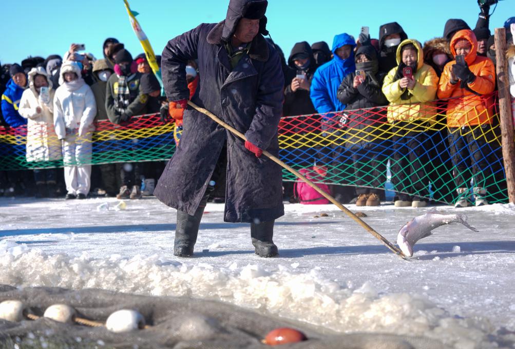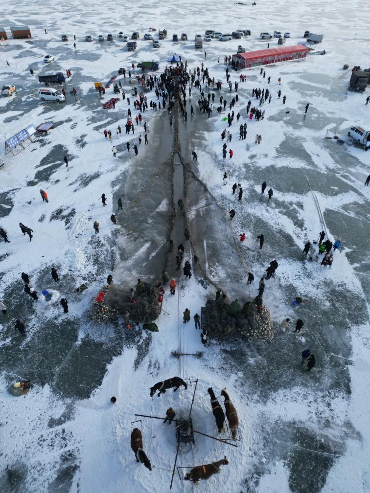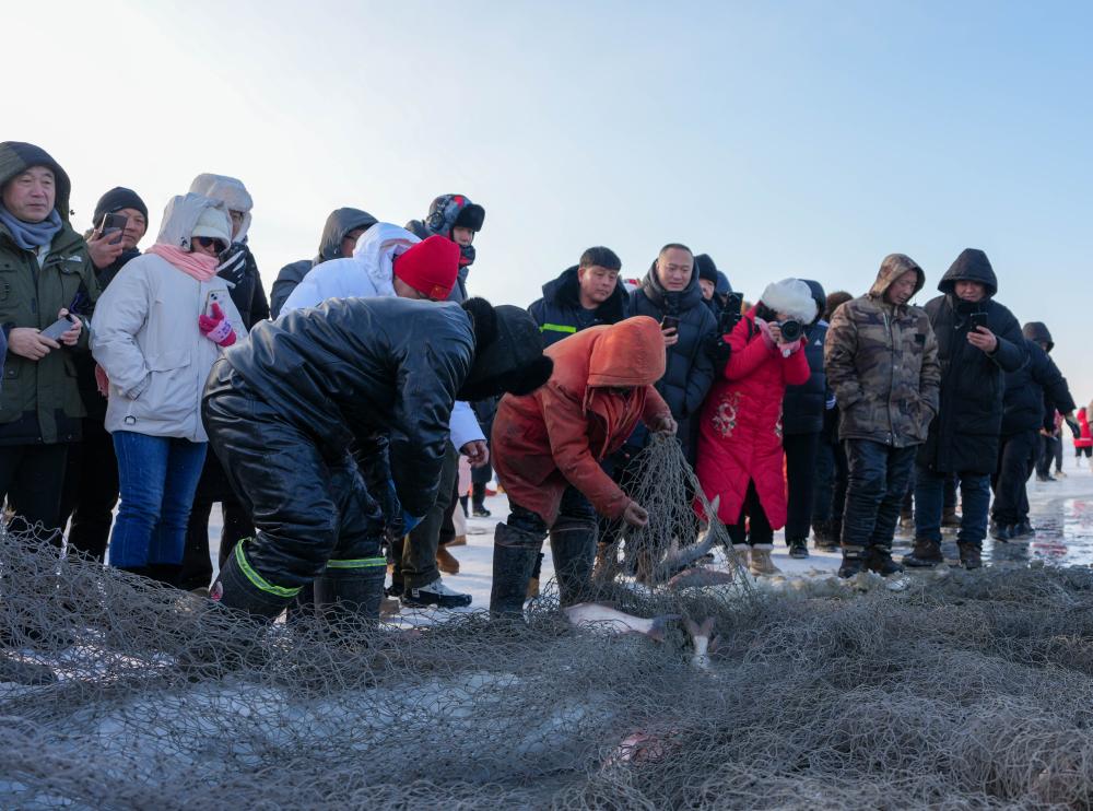 【新華社松原1月12日】中国吉林省松原市の査干(さかん)湖風景区で8日、吉林・査干湖第24回氷雪漁猟文化観光フェスティバルが開幕した。人力による氷の切り出しや馬による巻き上げ機の巻き上げ作業、氷の下に網を仕掛けて魚を取る伝統的な漁法などが次々と披露され、各地からやって来た観光客を引き付けた。