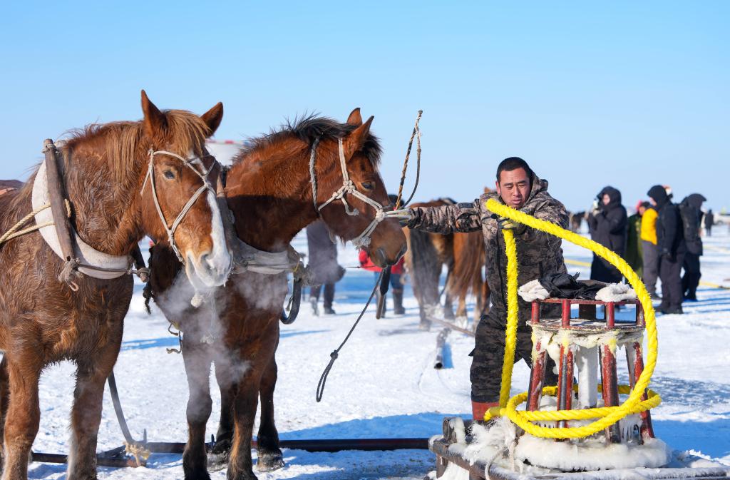 7日、吉林省松原市で漁網を引く巻き上げ機(ウインチ)と馬をひもで固定する漁師。(松原=新華社記者/顔麟蘊)