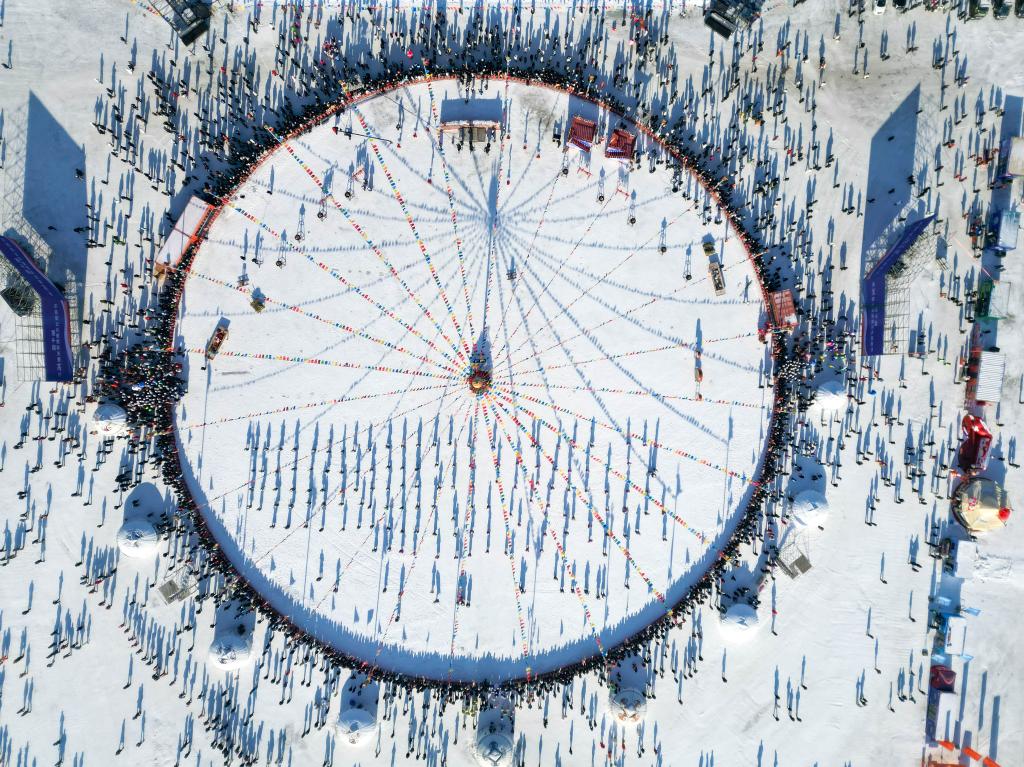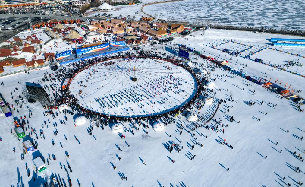 8日、吉林・査干湖第24回氷雪漁猟文化観光フェスティバルの開幕式に参加する人々。(ドローンから、松原=新華社記者/顔麟蘊)