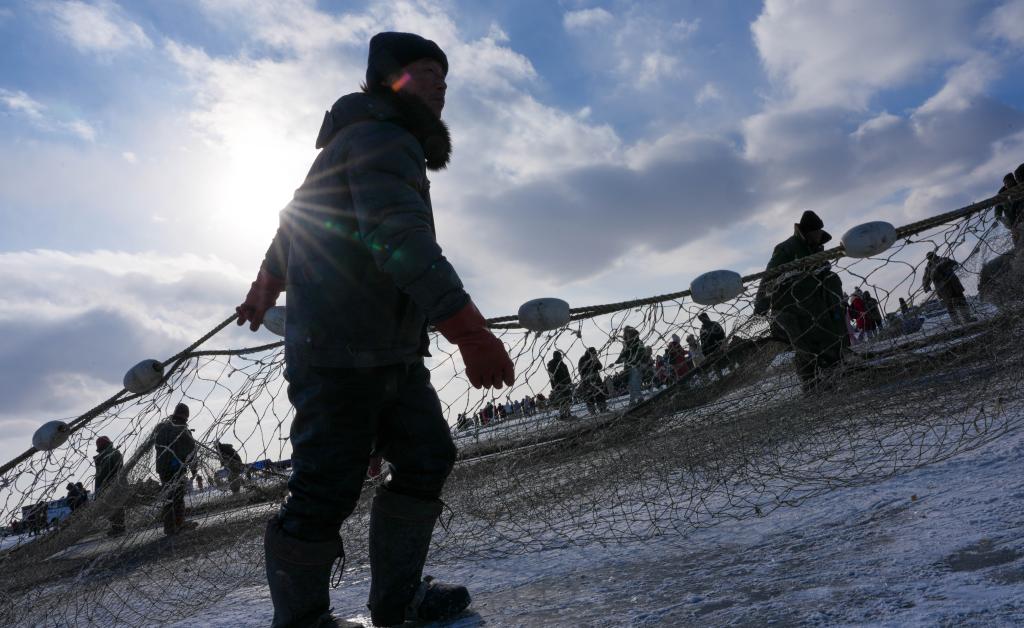 7日、吉林省松原市で、氷の上へ漁網を引き上げる漁師。(松原=新華社記者/顔麟蘊)