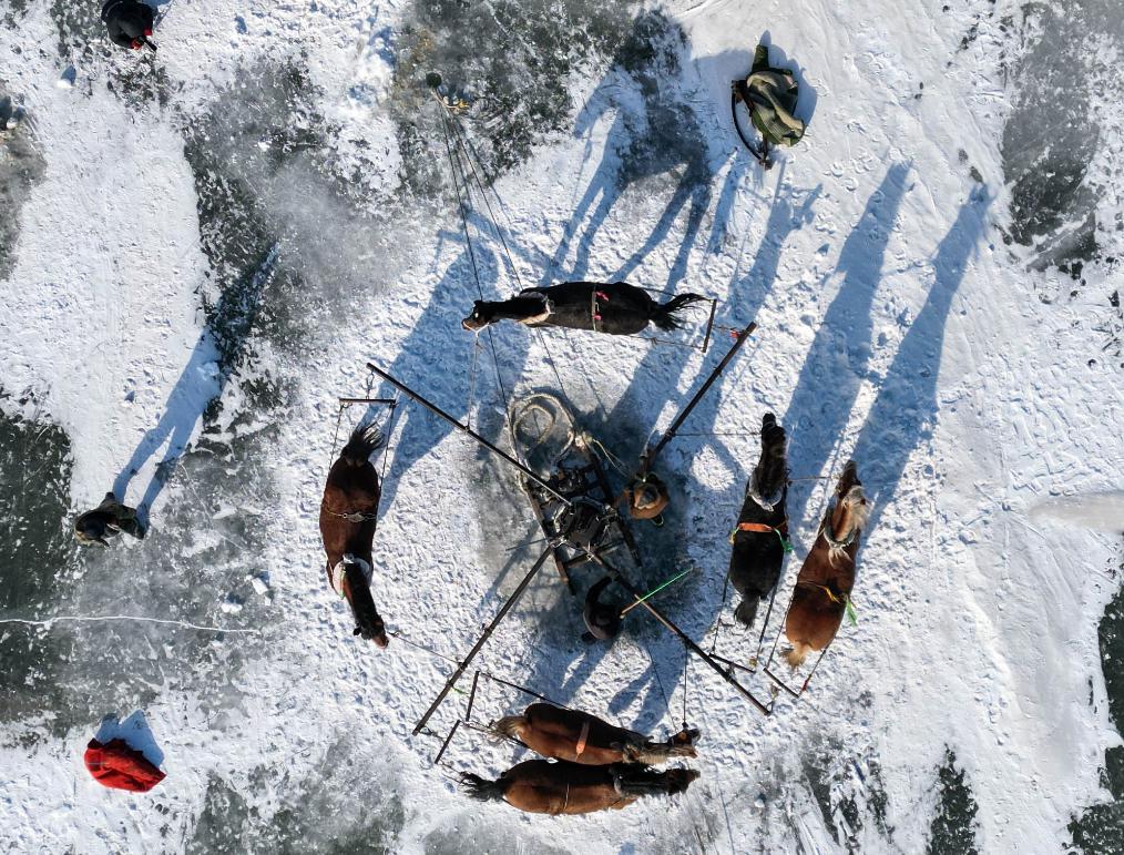7日、吉林省松原市にある査干湖の氷上で撮影した馬引き巻き上げ機(ウインチ)。(ドローンから、松原=新華社記者/顔麟蘊)