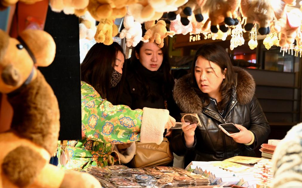 9日、敦煌夜市で商品を選ぶ観光客。(敦煌=新華社配信/張暁亮)