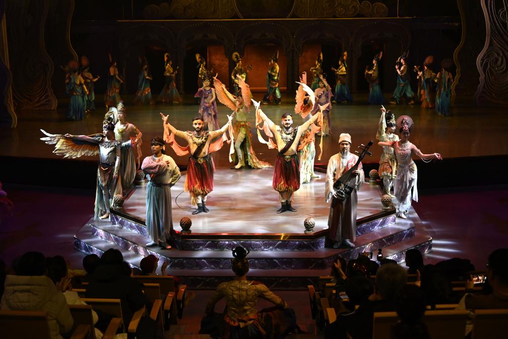 9日、洞窟空間を再現した舞台で上演された没入型演劇「楽動敦煌」の出演者と観客。(敦煌=新華社配信/張暁亮)