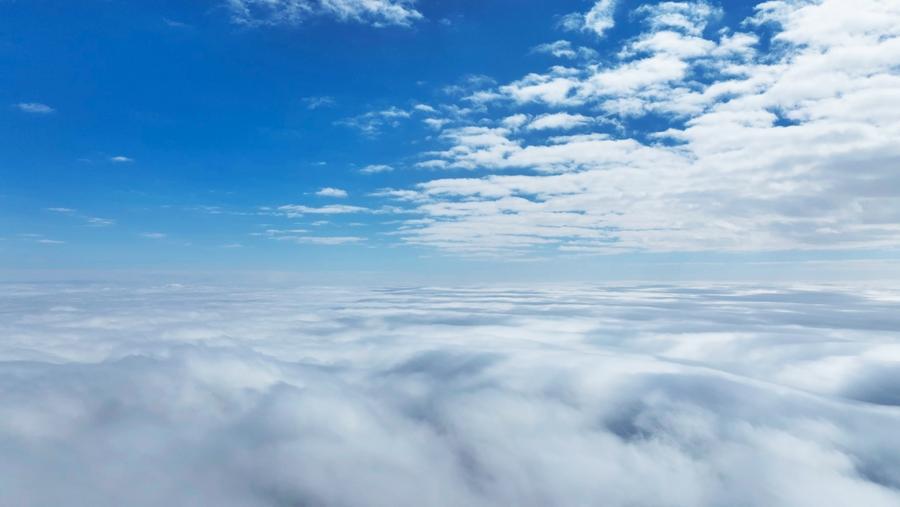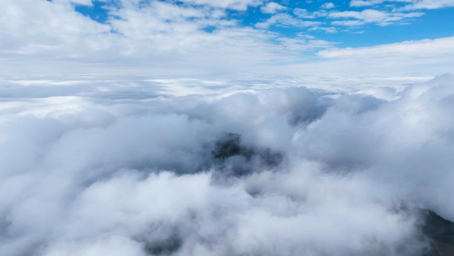 7日、梁王山の上空に立ち込めた雲海。(ドローンから、澄江=新華社配信/謝羅凱)