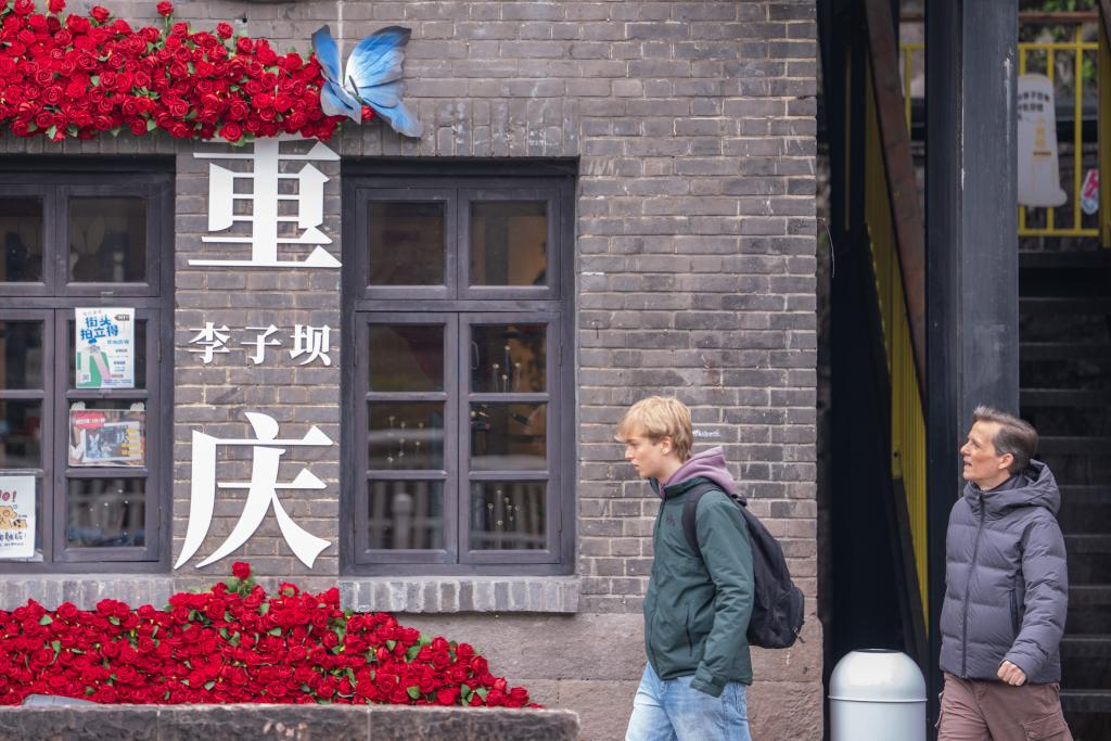 7日、重慶市渝中区の「映えスポット」李子壩(りしは)を散策する外国人観光客。(重慶=新華社記者/黄偉)