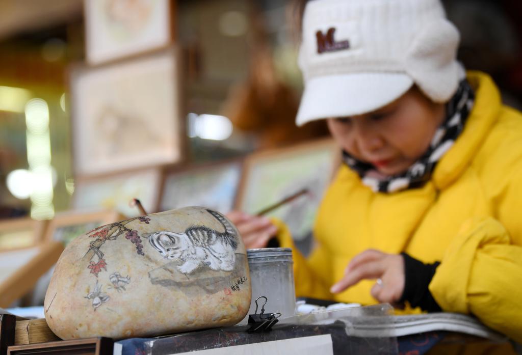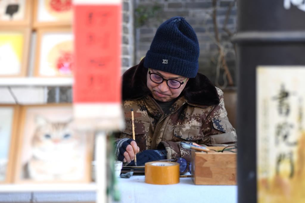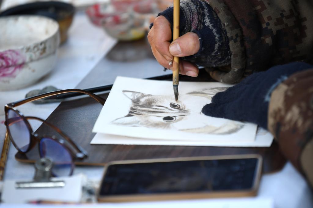 9日、西安市の書院門歴史文化街区でペットの絵を描く画家。(西安=新華社記者/李一博)