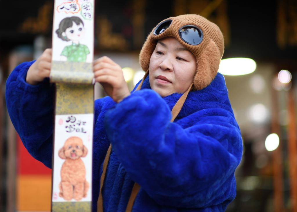 9日、西安市の書院門歴史文化街区でペットの絵を選ぶ観光客。(西安=新華社記者/李一博)