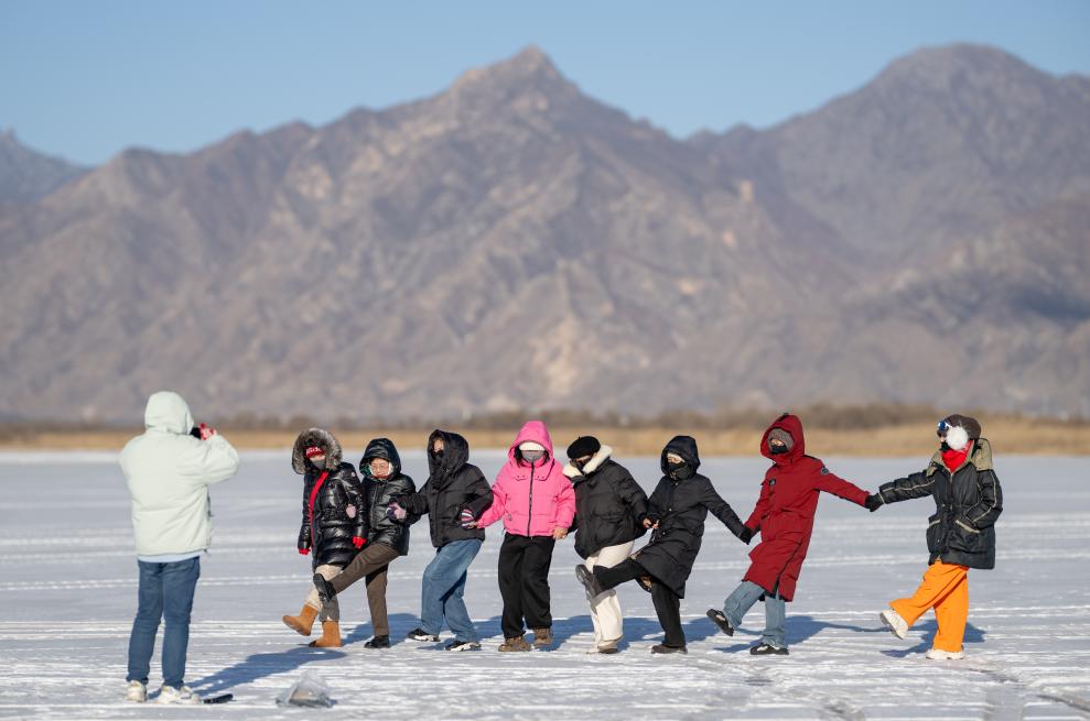 10日、フフホト市内の湖、哈素海で行われた冬季漁祭りの会場を歩く子ども。(フフホト=新華社記者/連振)