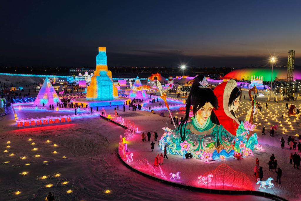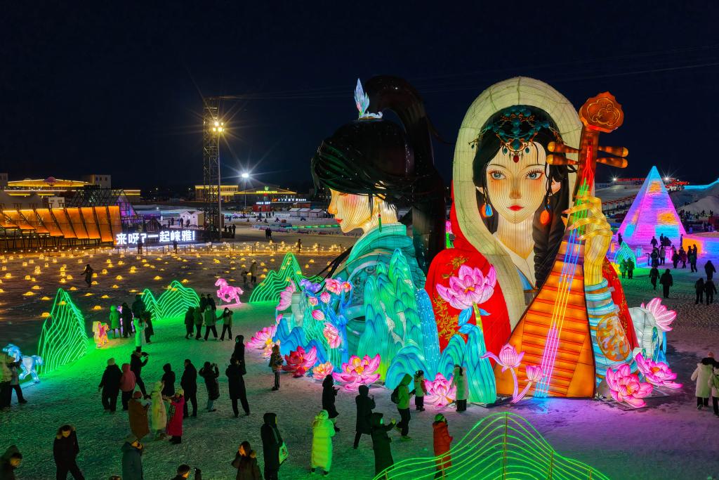 フフホト氷雪祭りの会場を散策する人々。(2025年12月31日、ドローンから、フフホト=新華社記者/連振)