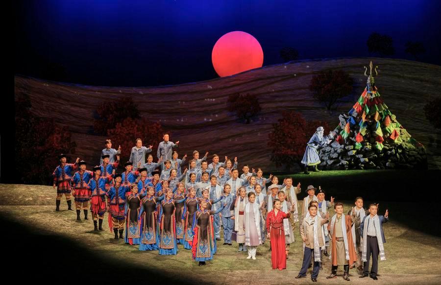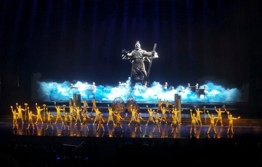 山東省徳州市斉河県の華林大劇院で上演された、黄河をテーマにした大型史詩劇の一場面。(2025年6月1日撮影、徳州=新華社配信/劉雨東)