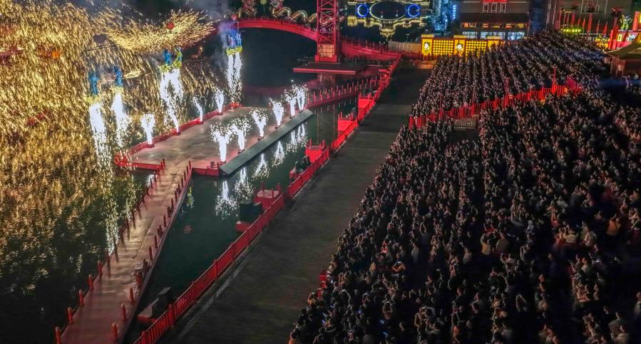 河北省唐山市豊南区の河頭老街風景区でパフォーマンスを観賞する観光客。(2025年10月7日、ドローンから、唐山=新華社配信/劉満倉)