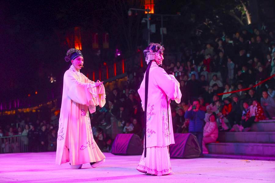 重慶市黔江区武陵水岸で伝統演劇「昆曲」を上演する江蘇省蘇州市昆劇院の俳優。(2025年12月19日撮影、重慶=新華社配信/楊敏)